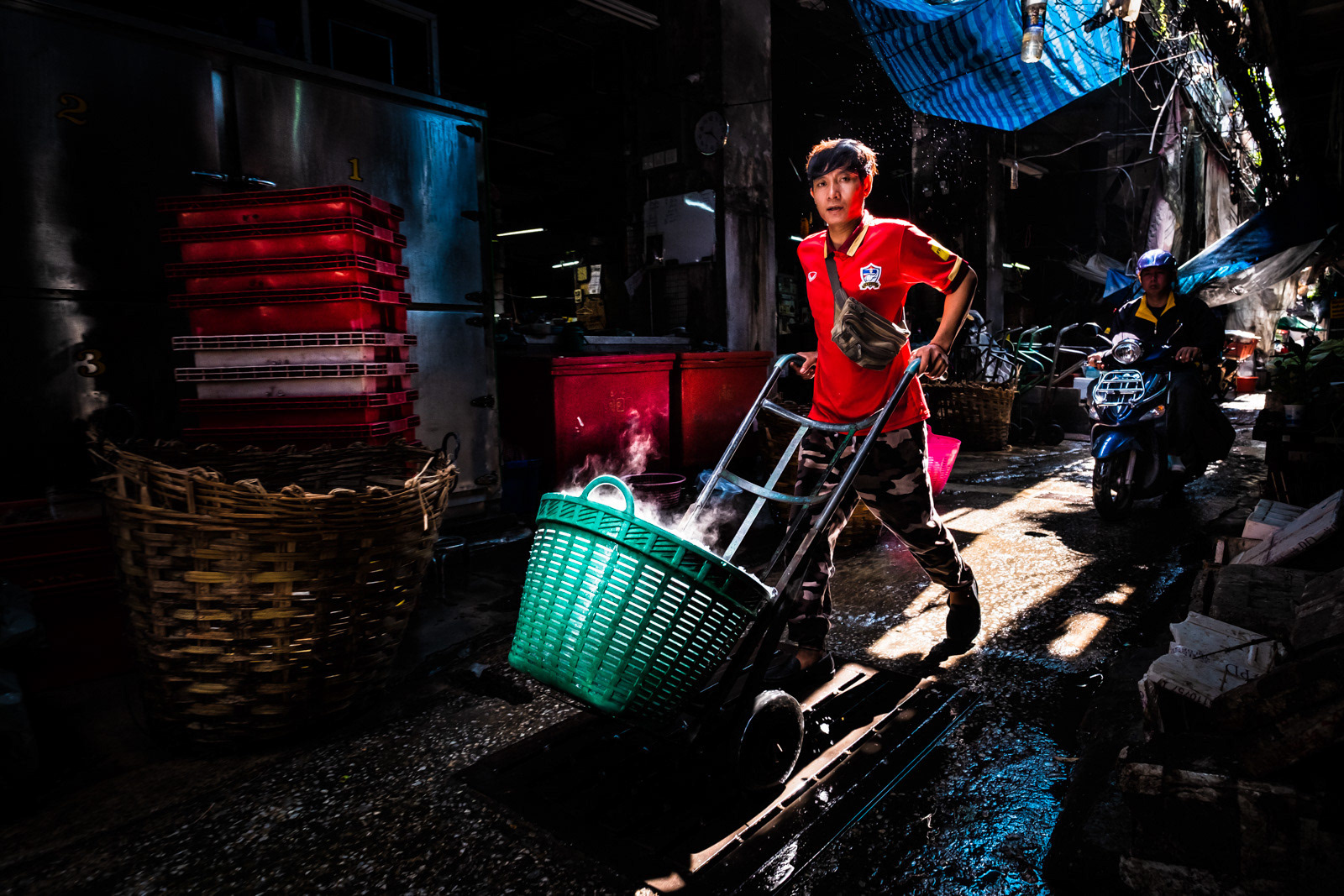 The Wet Market in Bangkok's Chinatown is about food. Especially moving of food. Nothing of this would be possible without the help of Porters. Plenty of Porters. The Porters are the ones that give the market the "buzz", running their trolleys up and down the wet narrow paths between the stalls. It's hot, it's humid and it's dark except for when the sun shines in between the tall buildings during some short minutes of the sun's travel over the sky. I've spent one year documenting this hard working men and women who keep it all going. This page is a tribute to all porters of Thailand.